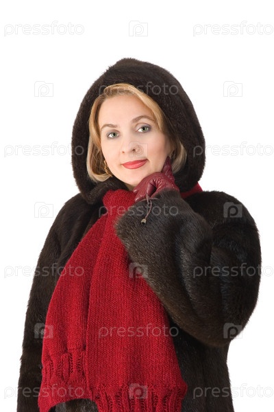 Молодая женщина в коричневой шубе с красным шарфом на белом фоне