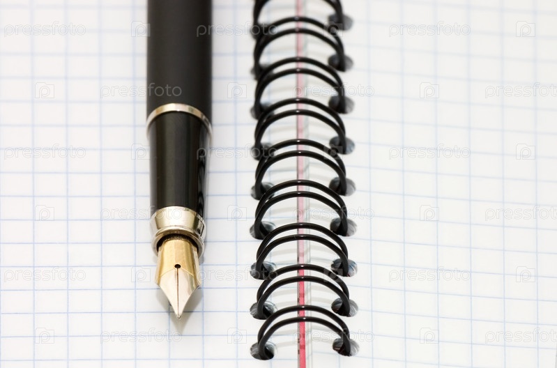 Перо лежит на записной книжке крупным планом