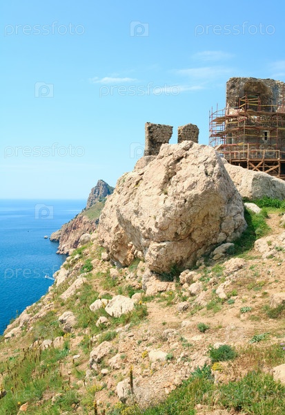 Вид на Генуэзскую крепость, прибрежные горы и синее море в Крыму летом