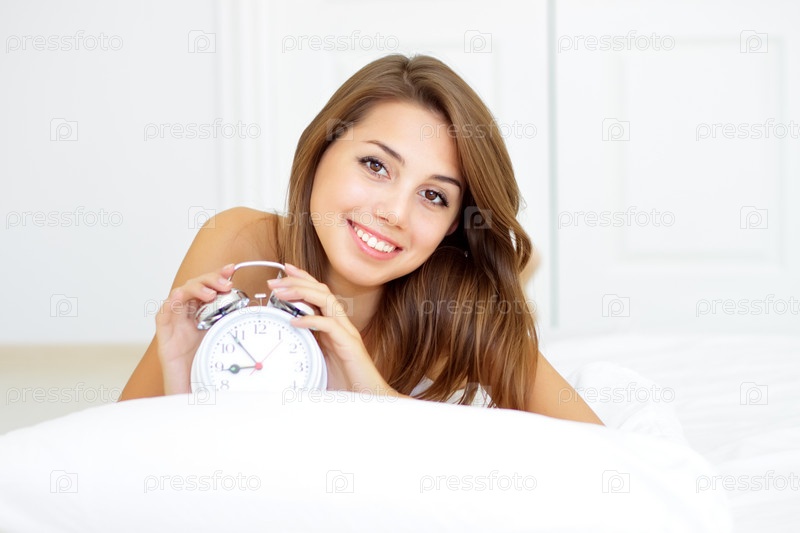 Девушка с будильником в кровати