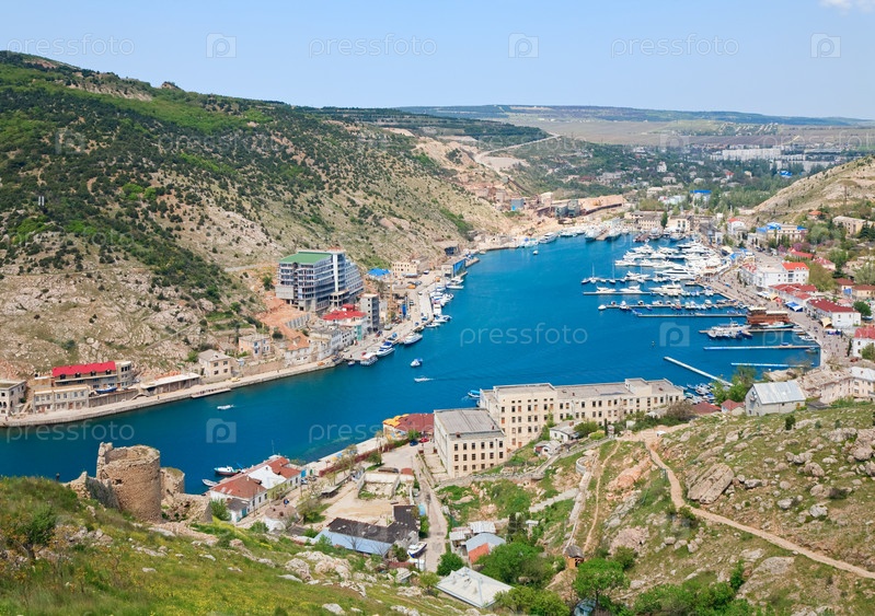 Причал города Балаклава, синяя река и горы на фоне голубого неба