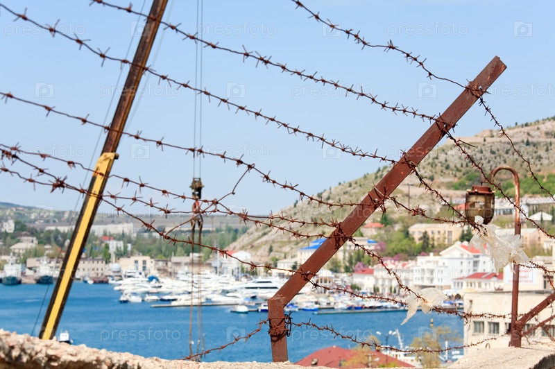 Вид через колючую проволоку на причал города Балаклава, синюю реку и горы на фоне голубого неба