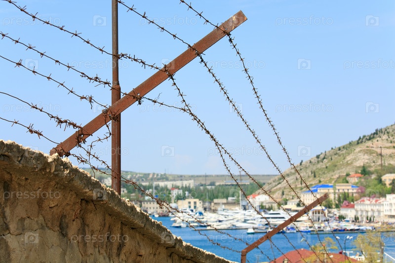 Вид через колючую проволоку на причал города Балаклава, синюю реку и горы на фоне голубого неба