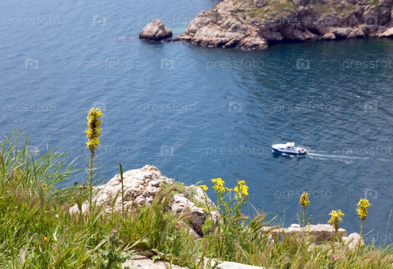 Скалистый берег и белая яхта в синем море