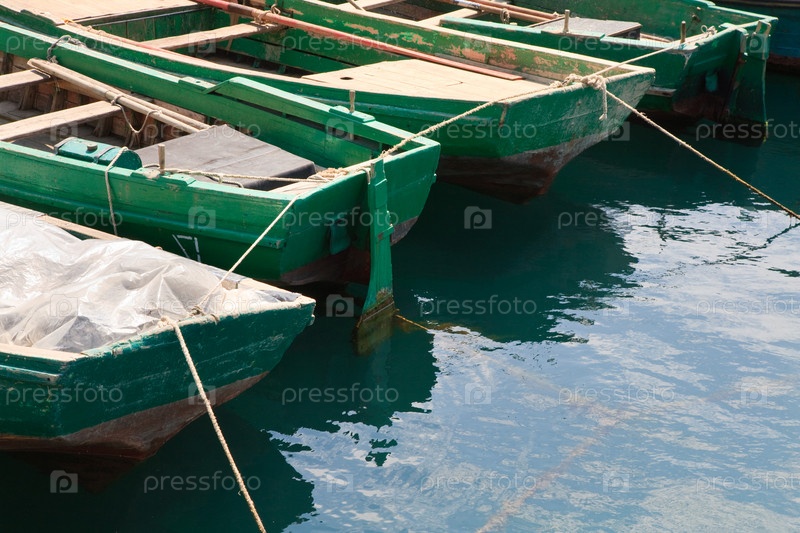 Деревянные лодки зеленого цвета стоят на пирсе в воде