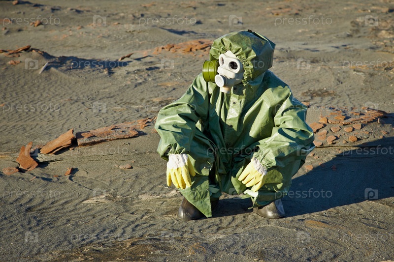 Ученый в костюме химзащиты и противогазе сидит в пустыне