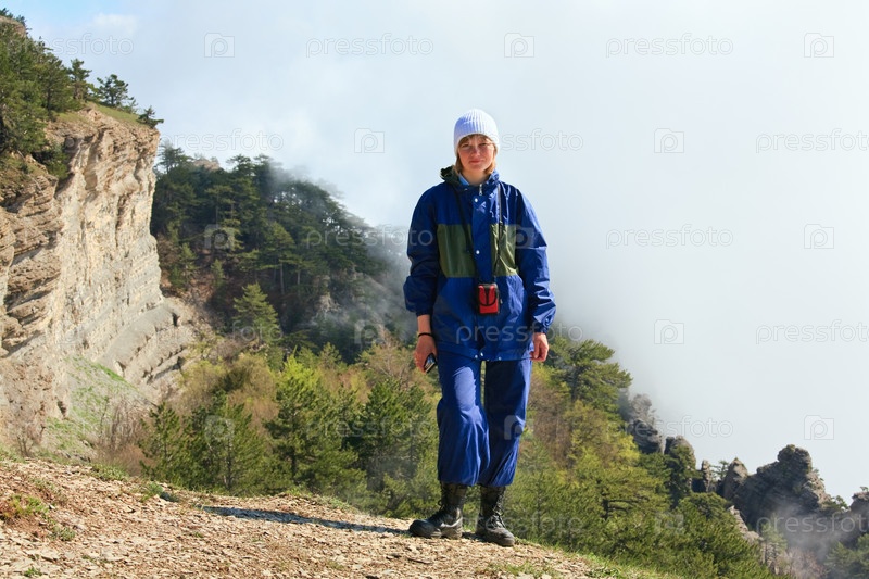 Туристка в синем костюме стоит на склоне горы Ай-Петри на фоне зеленых хвойных деревьев и туманного неба