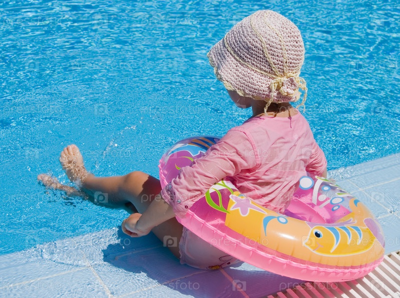 Девочка с надувным кругом сидит у бассейна