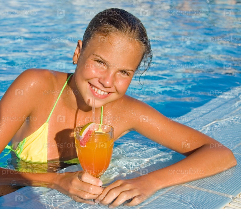 Портрет загорелой девочки с фруктовым коктейлем в бассейне
