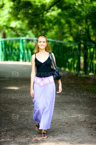 Улыбающаяся девушка гуляет в летнем парке