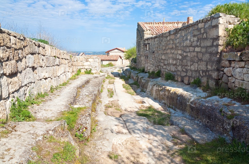 Каменистая дорога и каменные стены на фоне голубого неба
