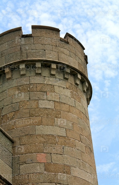 Кирпичная круглая башня Воронцовского дворца на фоне голубого облачного неба