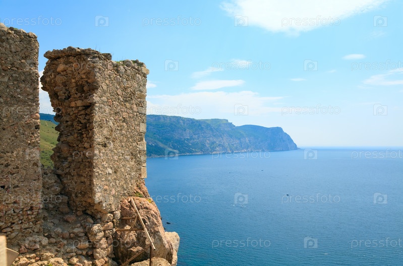 Руины Генуэзской крепости на фоне синего моря, прибрежных гор и голубого неба