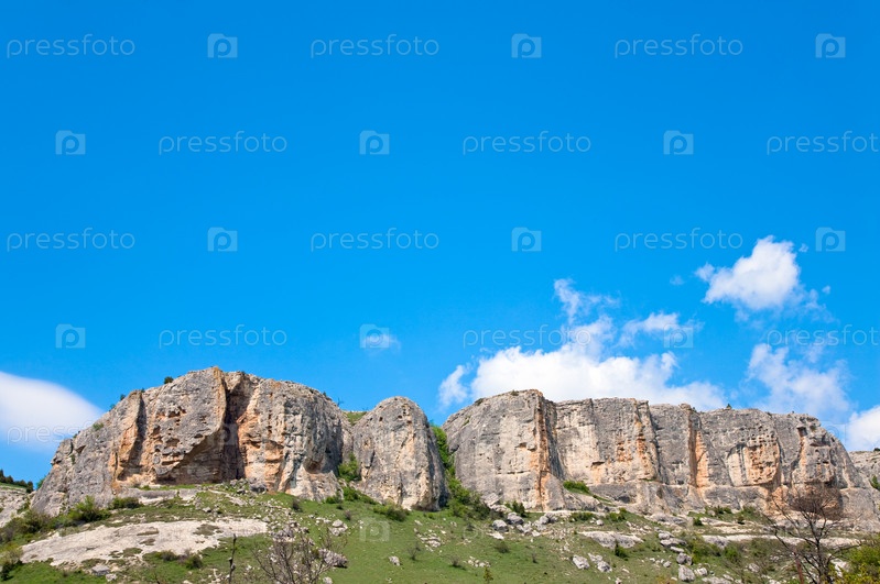 Каменистые горы в районе древнего городища Чуфут-Кале на фоне голубого неба