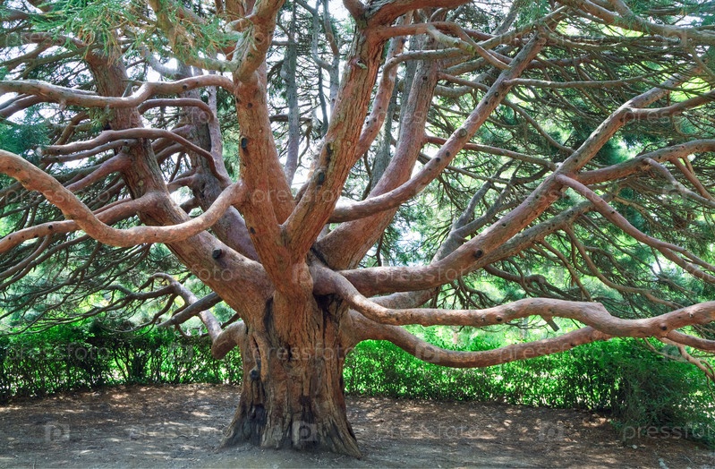 Большое вечнозеленое дерево Земляничник греческий в весеннем парке Крыма