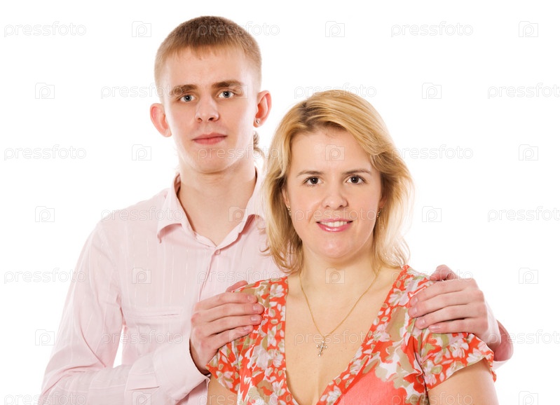 Мать и взрослый сын на белом фоне