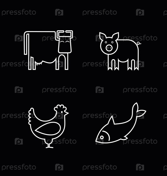 Набор стилизованных икон - коровы, рыбы, курицы и свиньи. Иконы, представляющие птицу, говядину, свинину и морепродукты или их ценность в продукте. Белое изображение (очертание) на черном фоне