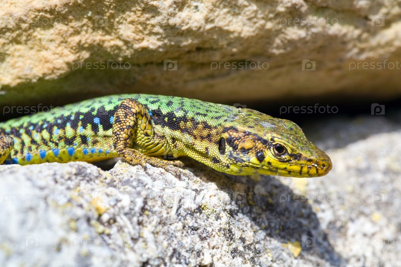 Ящерица желто-зеленой окраски на камнях