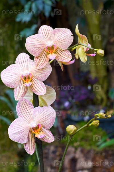 Пурпурно-желтая пятнистая орхидея на клумбе