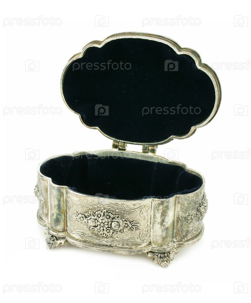 Древняя серебряная коробка открыта, изолирована на белом фоне