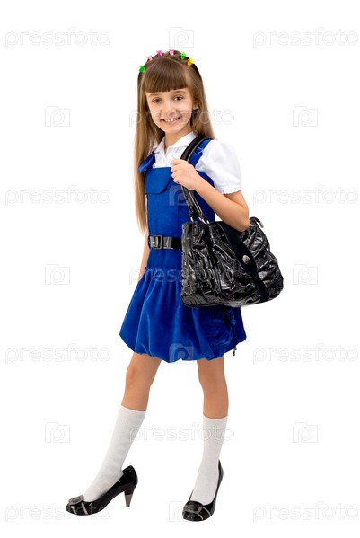 Маленькая девочка, примеряющая обувь и сумку матери на себя