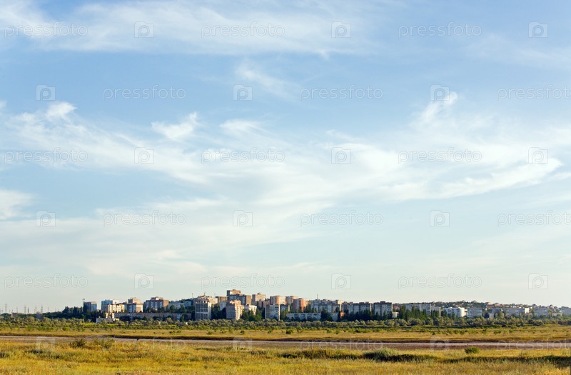 Город Щелкино и шоссе на фоне облачного неба