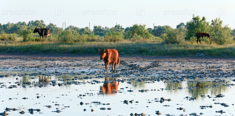Стадо коров пасется на зеленом лугу вблизи болота