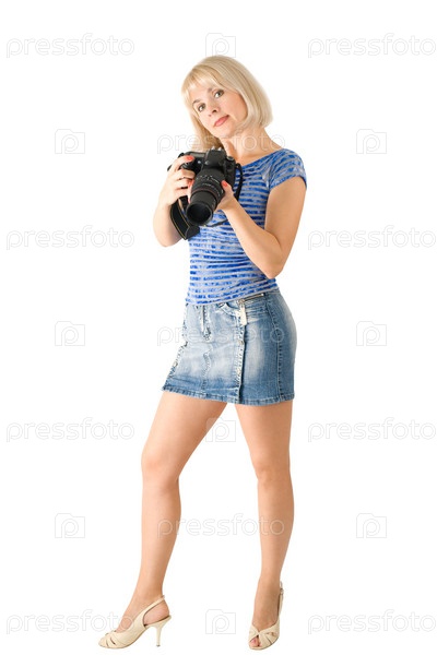 Молодая женщина-фотограф на белом фоне