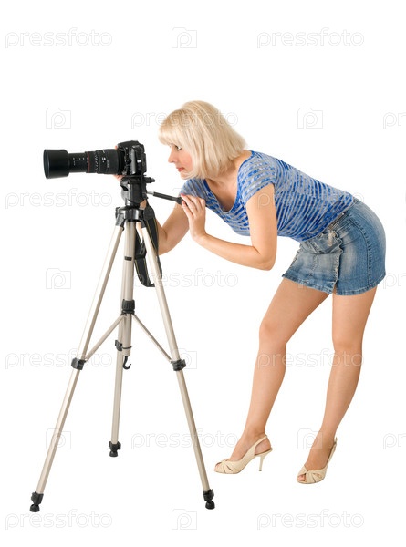 Молодая женщина-фотограф на белом фоне