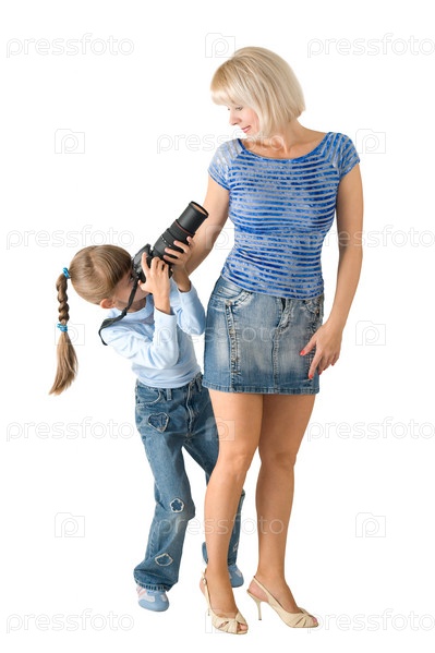 Маленькая дочка, фотографирующая свою маму