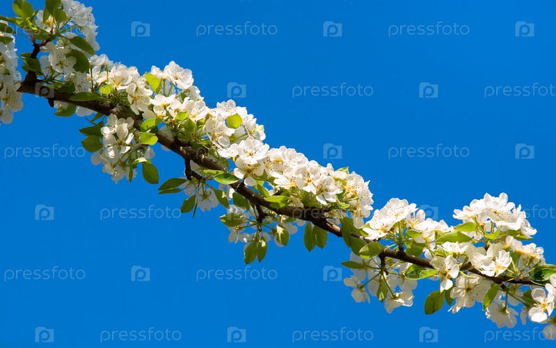 Цветущие ветви грушевого дерева на фоне голубого неба