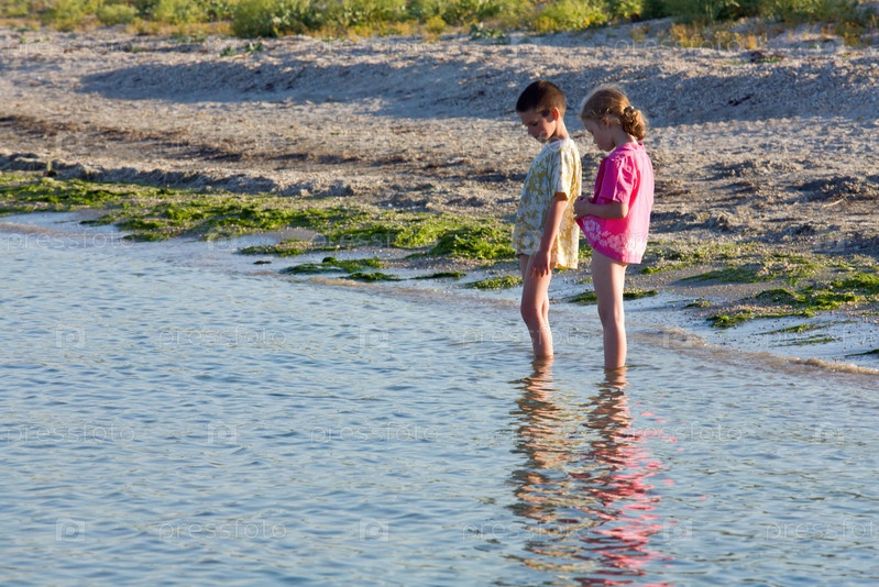 Дети стоят в воде на пляже