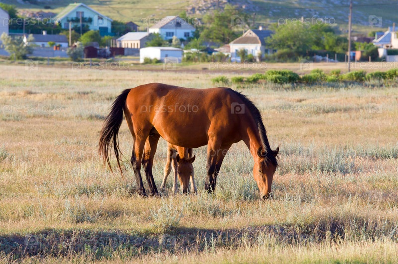 Лошадь с жеребенком на пастбище