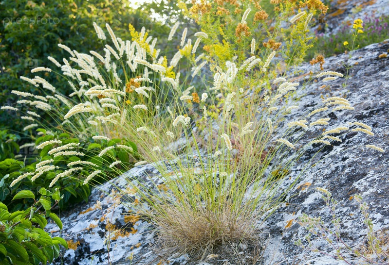 Летняя зелено-желтая трава растет на горном камне
