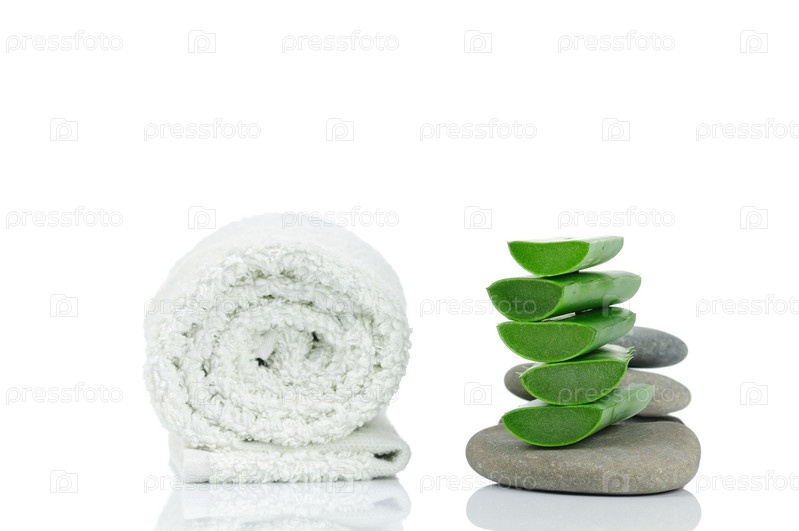 Подготовленные к спа-процедуре камни, алоэ и влажное полотенце