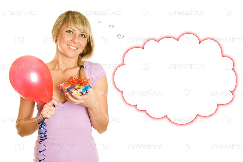 Мечтательная девушка с шаром и подарком в руках