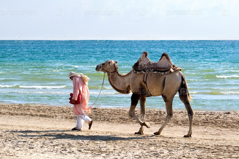 Пастух с верблюдом идет по берегу моря