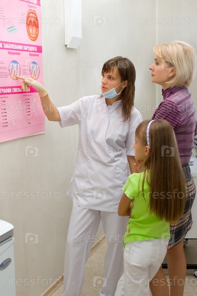Стоматолог показывает маме с дочкой плакат с заболеваниями зубов
