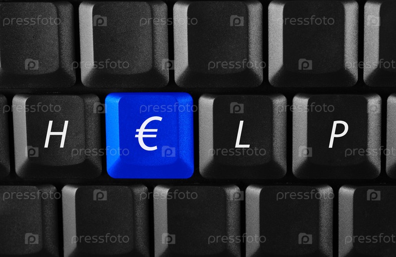 Компьютерная клавиатура с синей клавишей со знаком "евро", обозначение необходимой денежной помощи