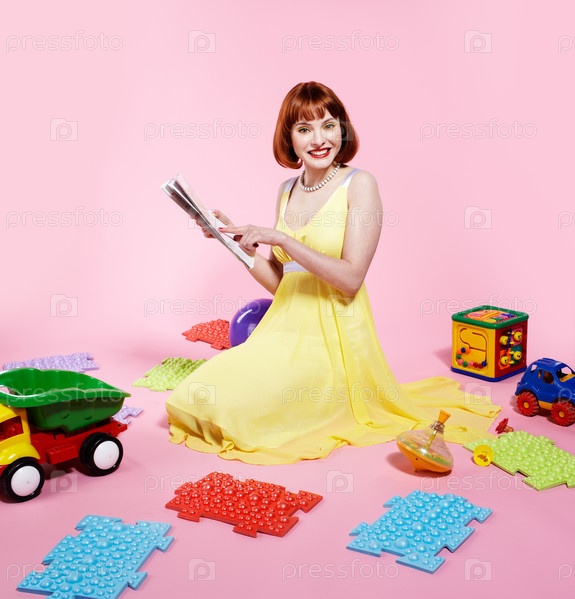 Женщина сидит на полу с журналом и игрушками
