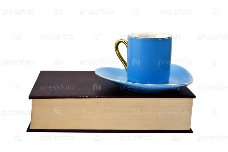 Книга и голубая чашка на белом фоне