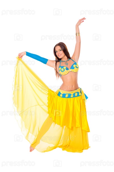 Красивая молодая брюнетка исполняет танец живота