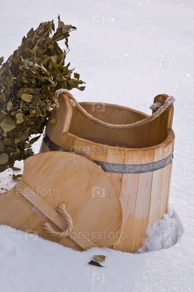 Деревянная кадка и березовый веник на снегу