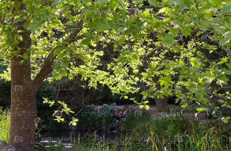 Клен с зелеными листьями возле пруда