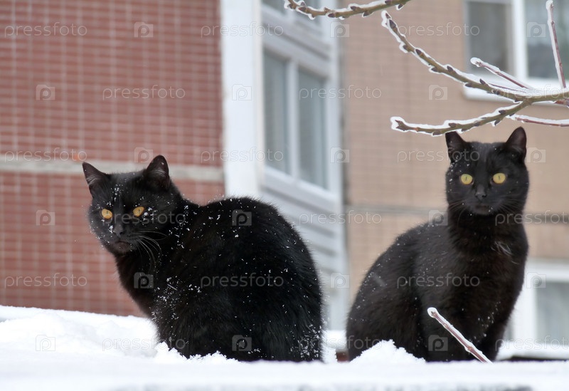 Две черные пушистые кошки на снегу