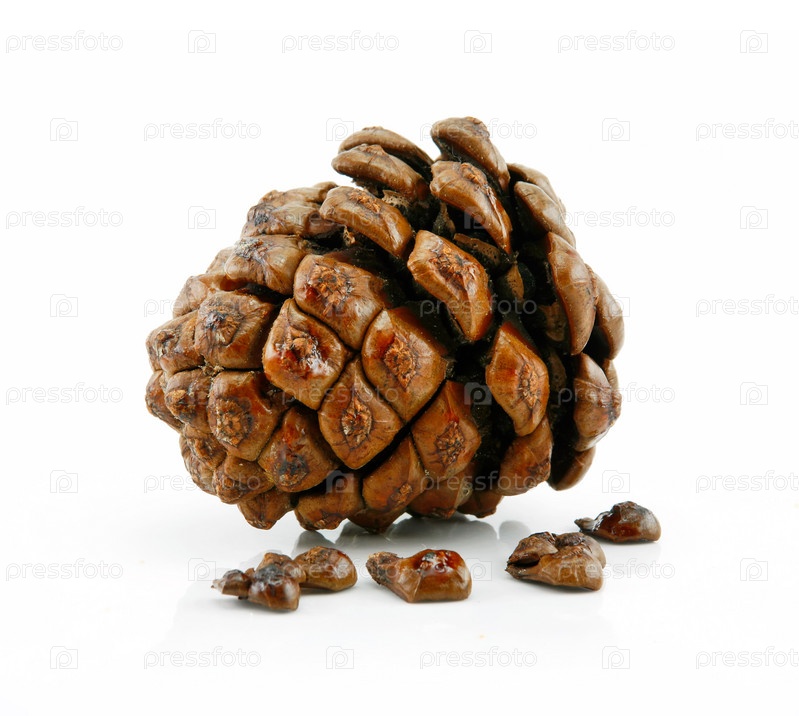 Конус и орехи сибирского кедра изолированы на белом фоне