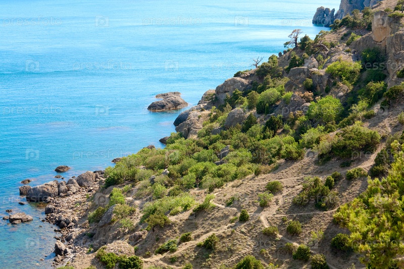 Скалистое побережье синего моря в заповеднике Новый Свет