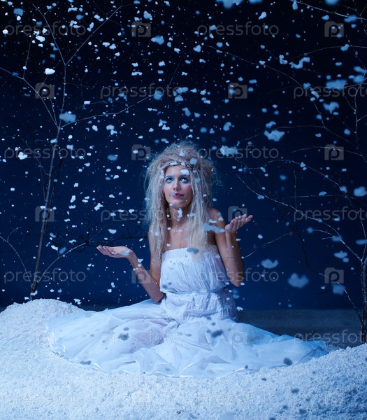Сказочная фея сидит на снегу в снегопад