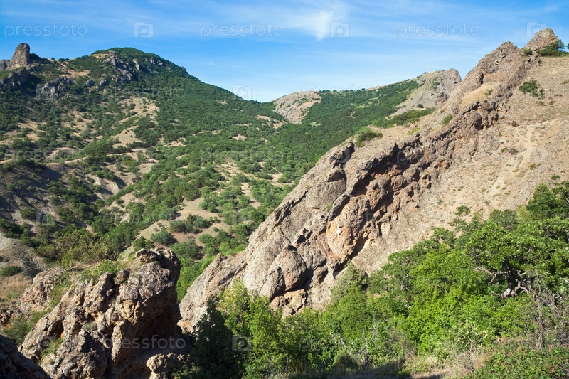 Горный пейзаж в заповеднике Карадаг на фоне голубого неба