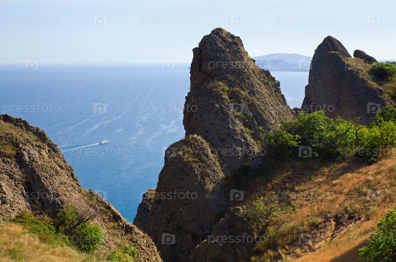 Прибрежные скалы в заповеднике Карадаг на фоне синего моря и голубого неба